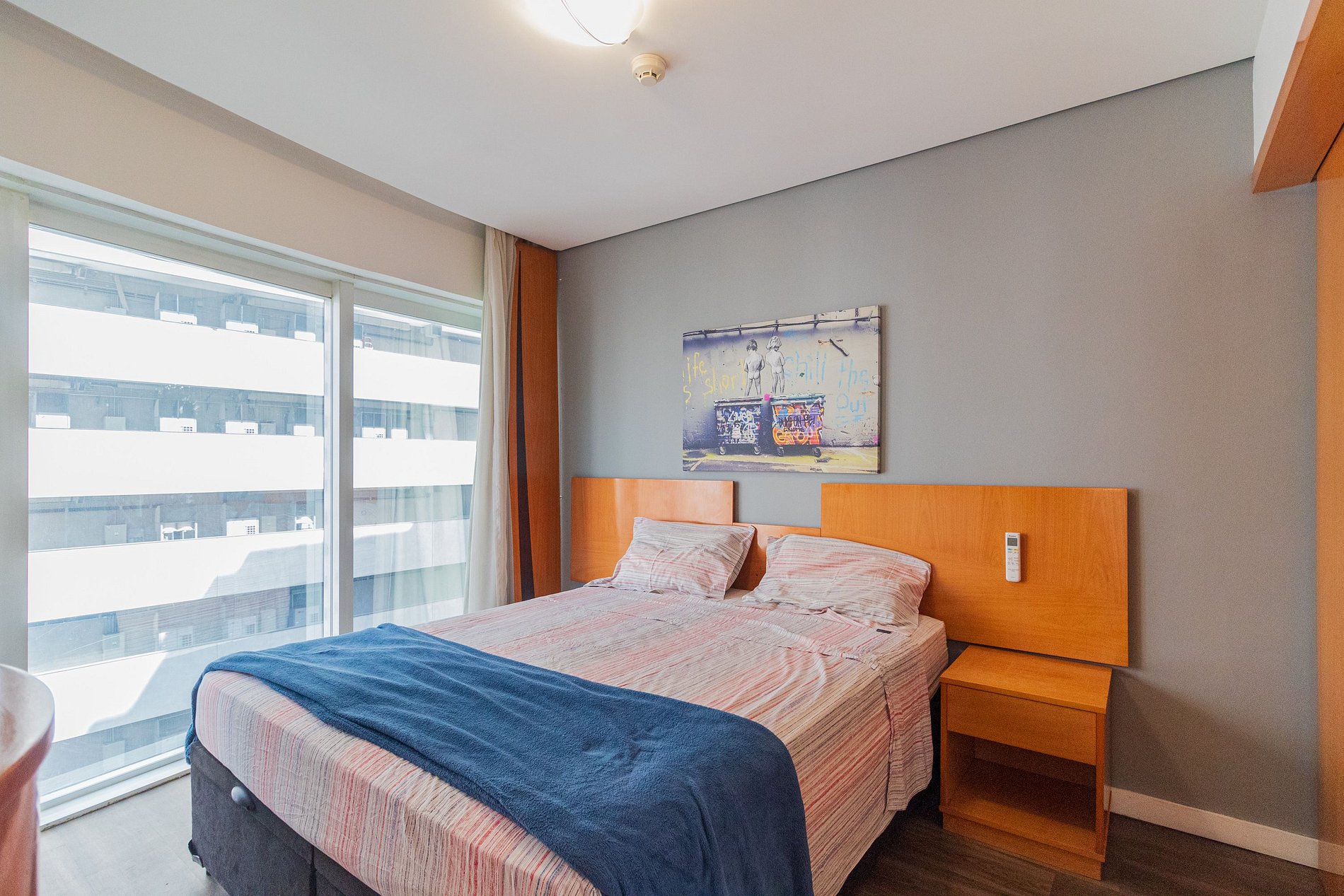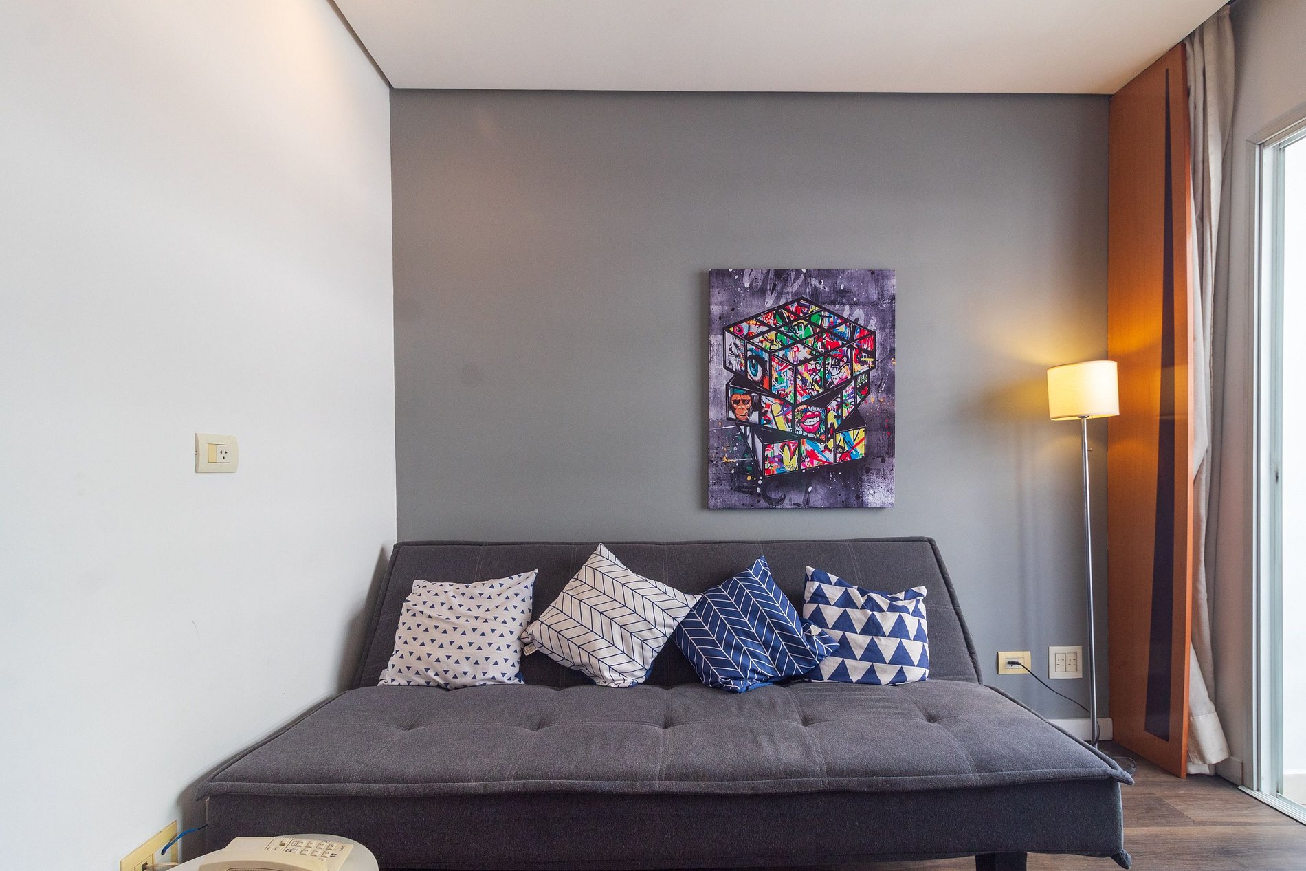 -Flat possui uma suíte com cama de casal, um sofá cama e dois colchões para colocar no chão, ideal para acomodar até cinco hóspedes.