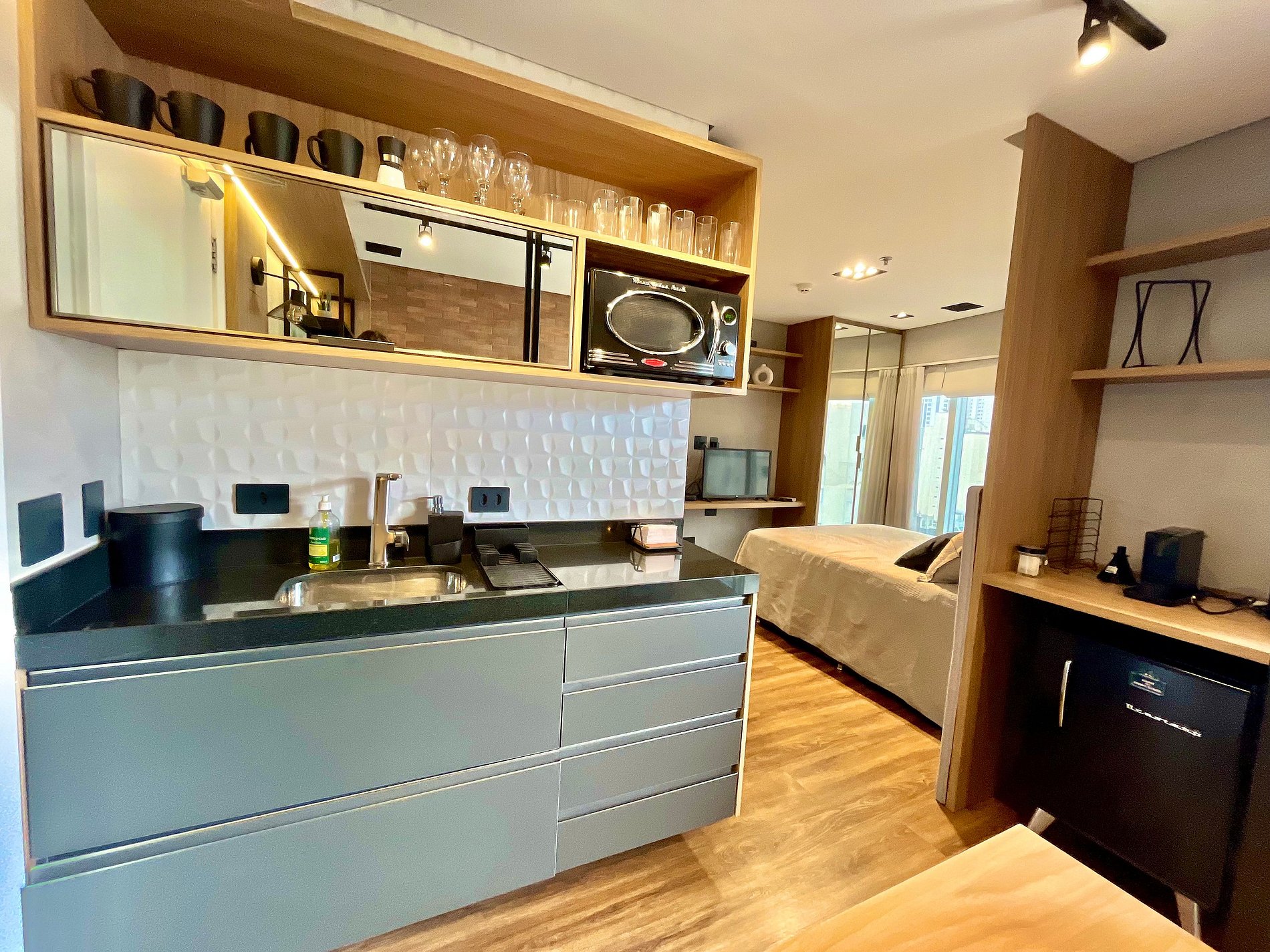 Cozinha kitnet (frigobar, microondas , cafeteira, sanduicheira e liquidificador)