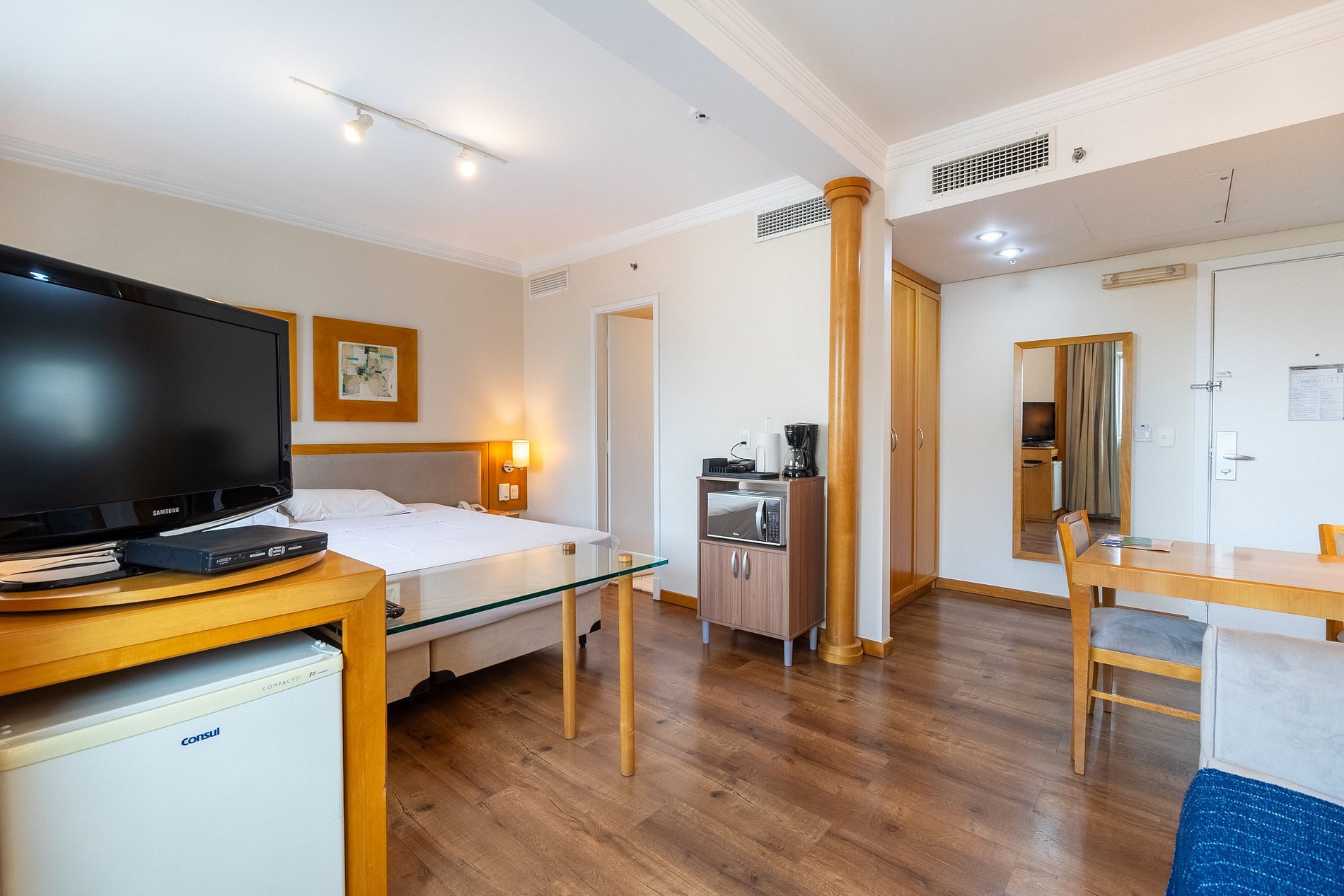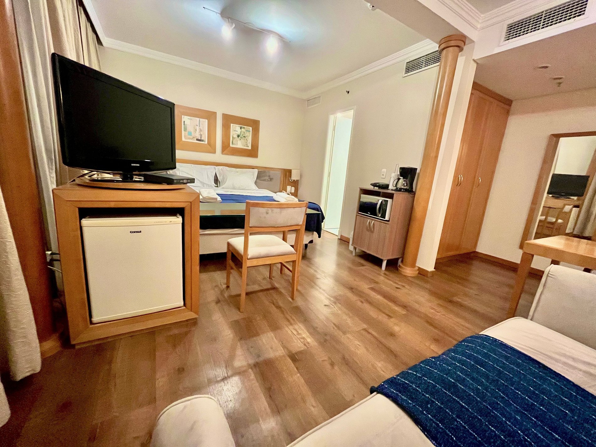 -Flat possui uma suíte com duas camas de solteiro King , um sofá cama , ideal para acomodar até quatro hóspedes.