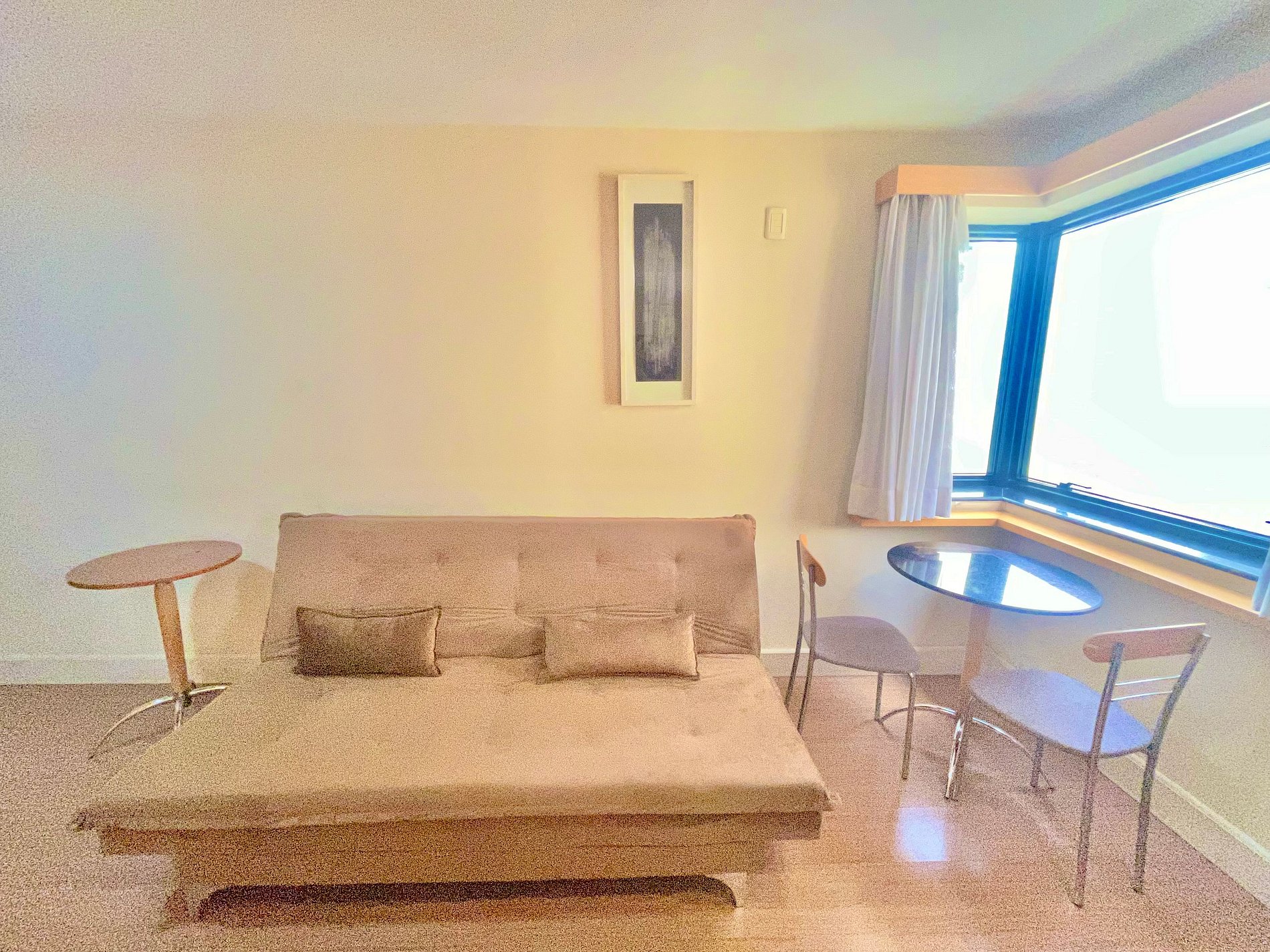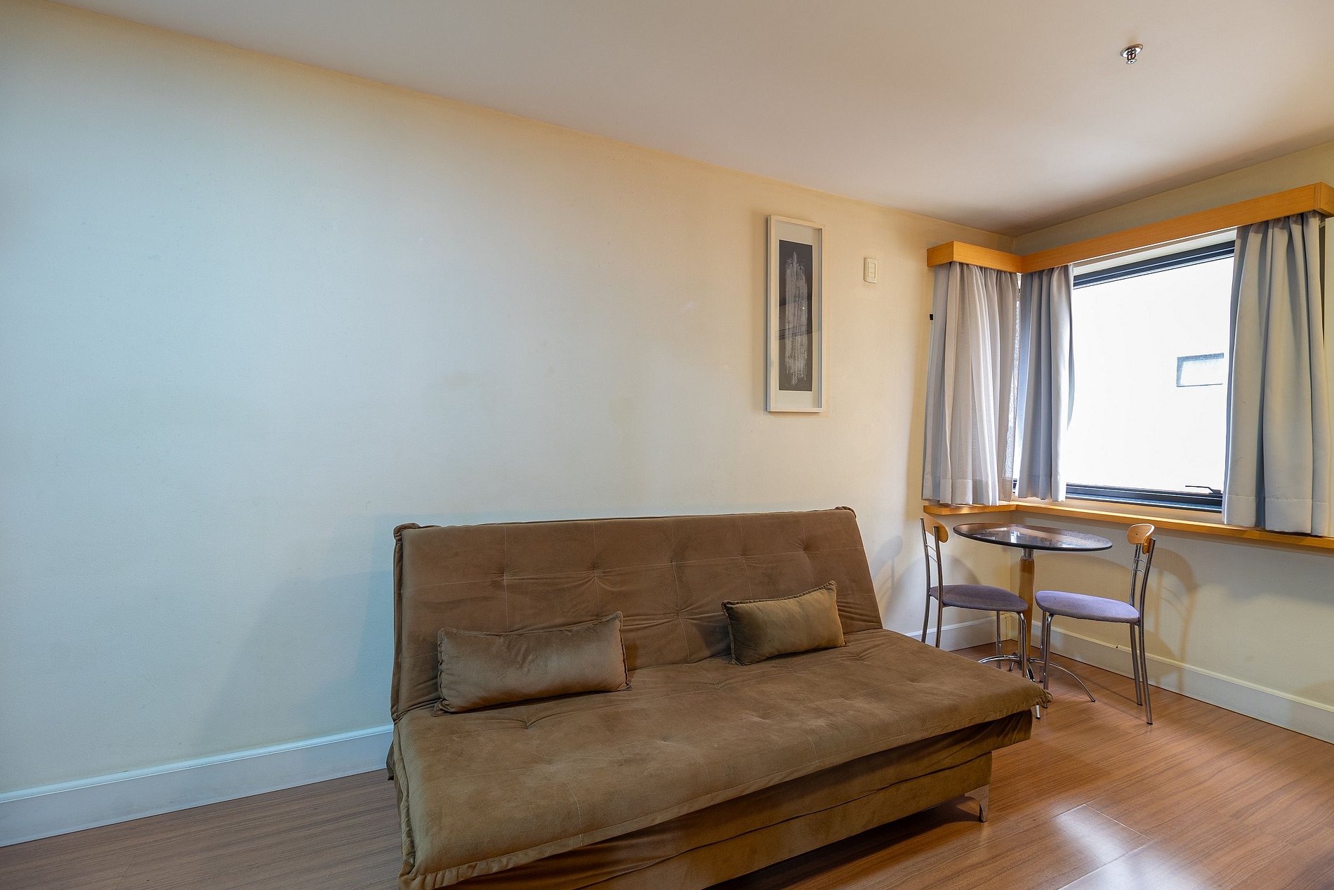 -Flat possui uma suíte com cama de casal, um sofá cama e dois colchões para colocar no chão, ideal para acomodar até cinco hóspedes.