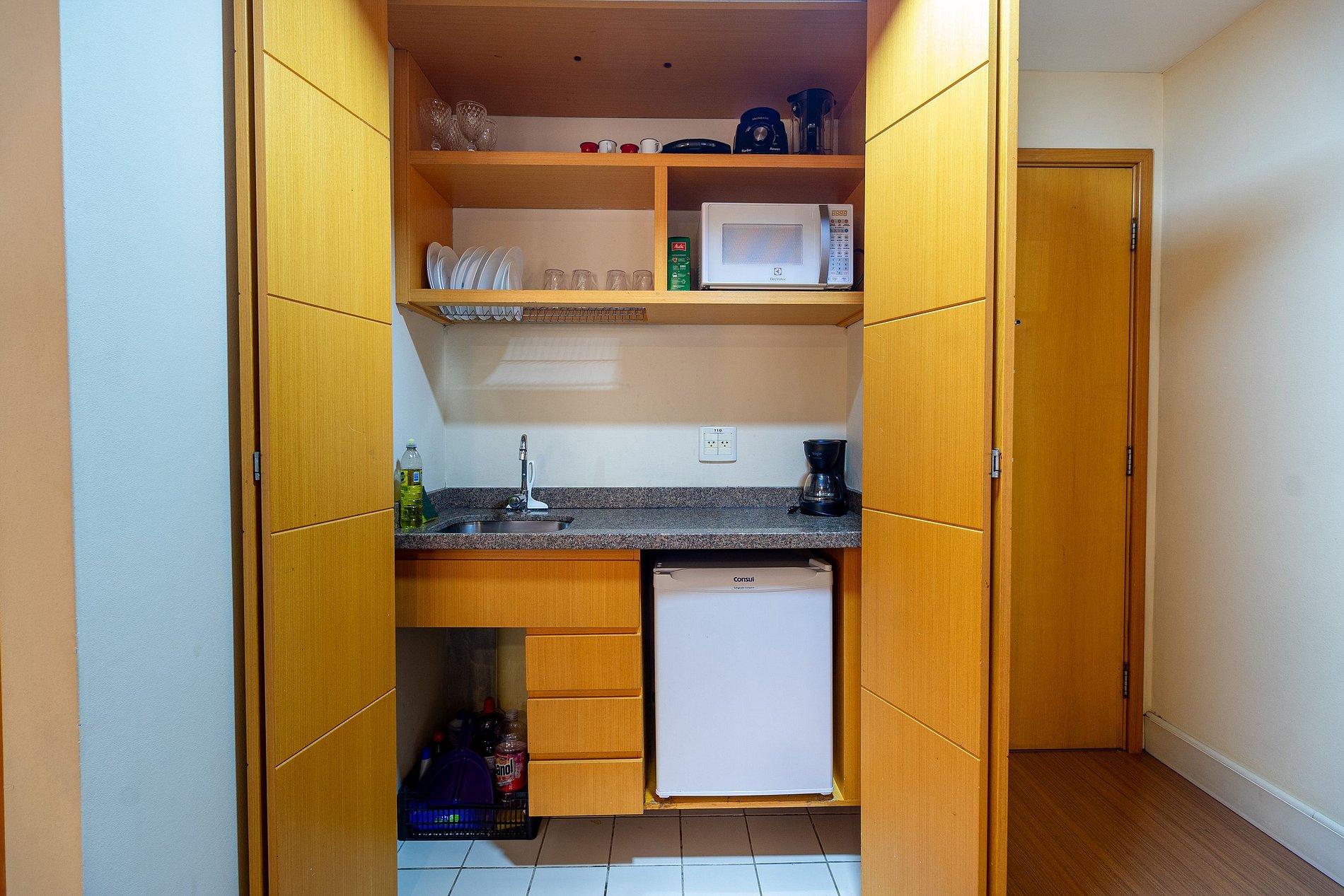 Cozinha kitnet (frigobar, microondas , cafeteira, sanduicheira e liquidificador)