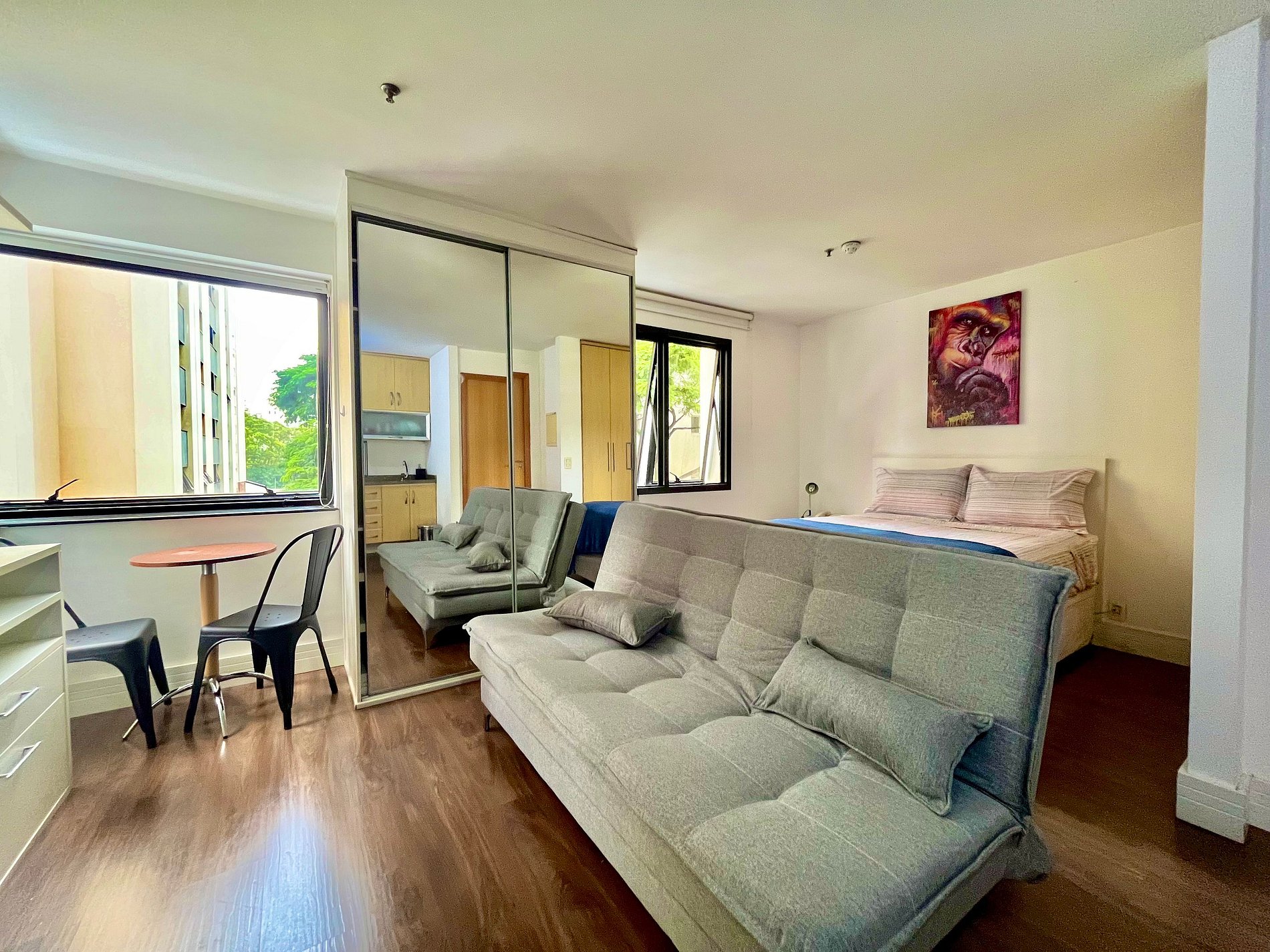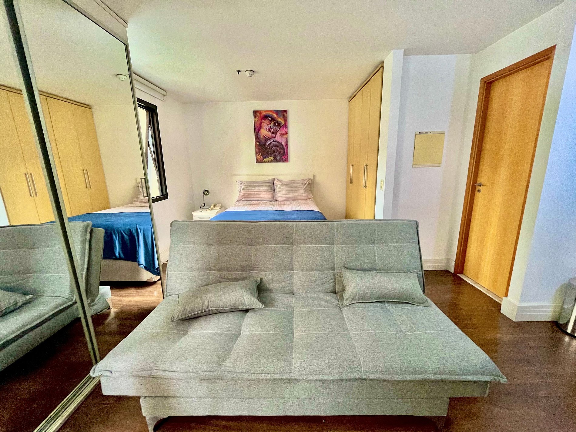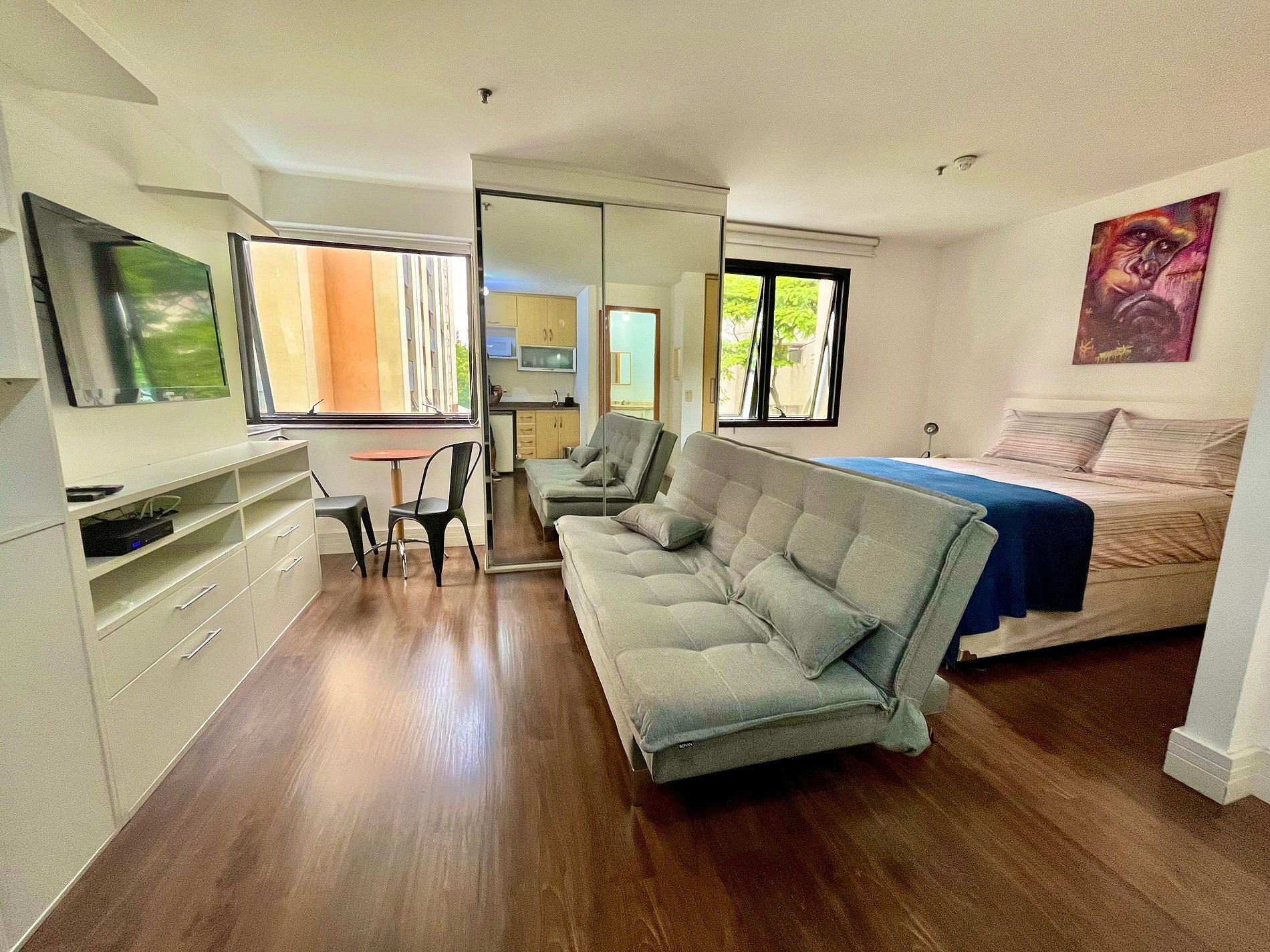 Flat com cama Queen, sofá cama de Casal