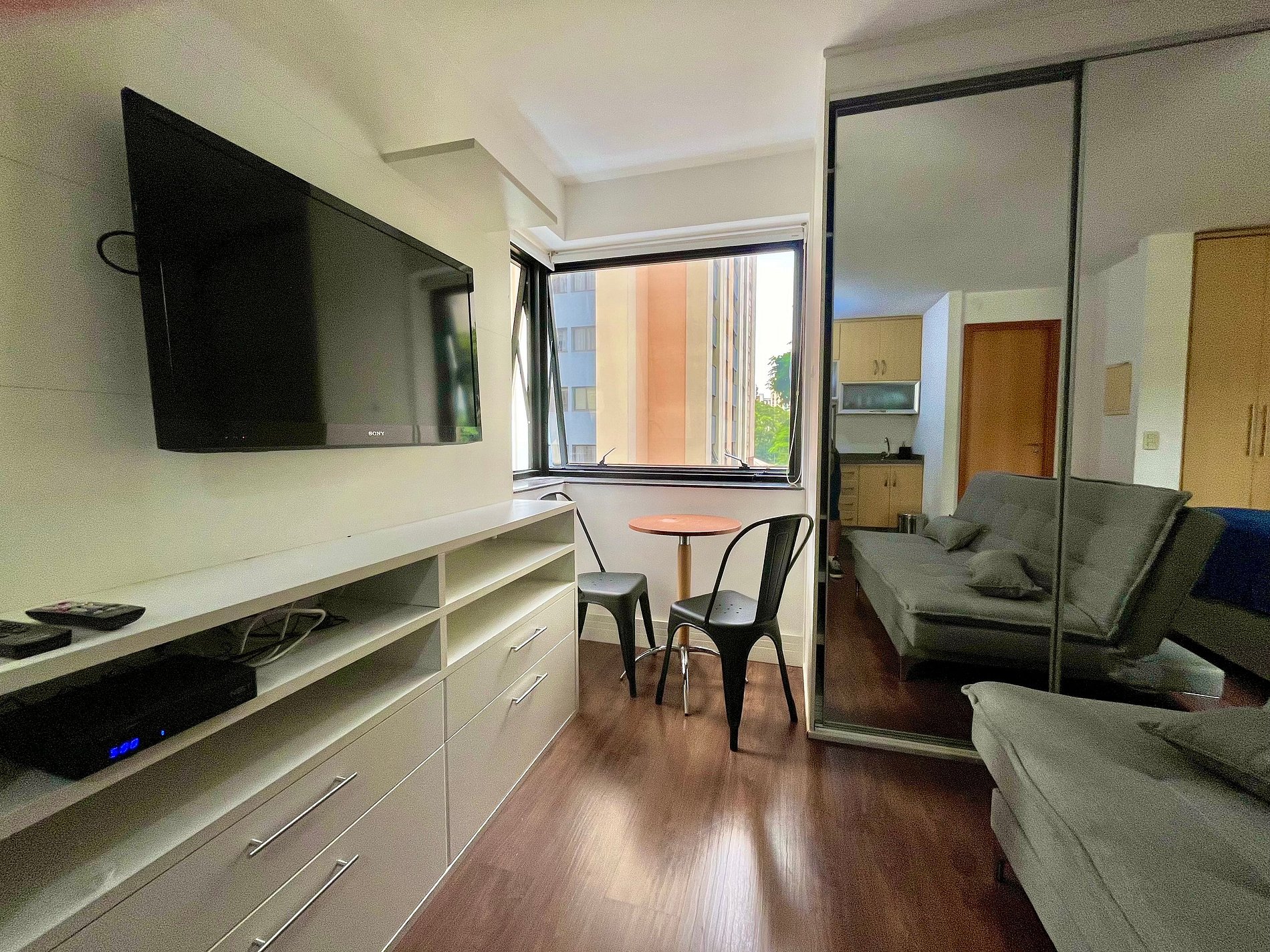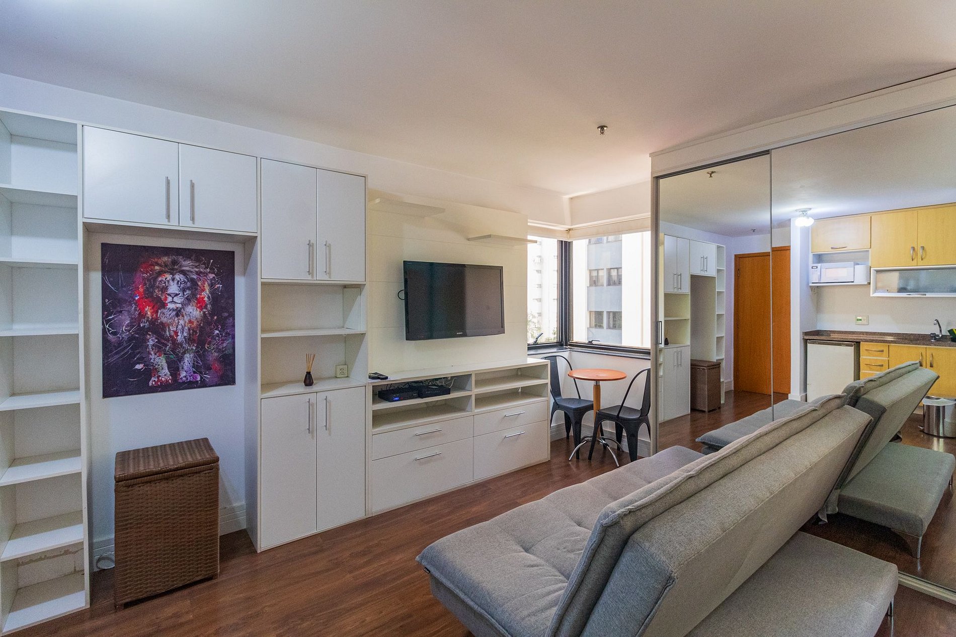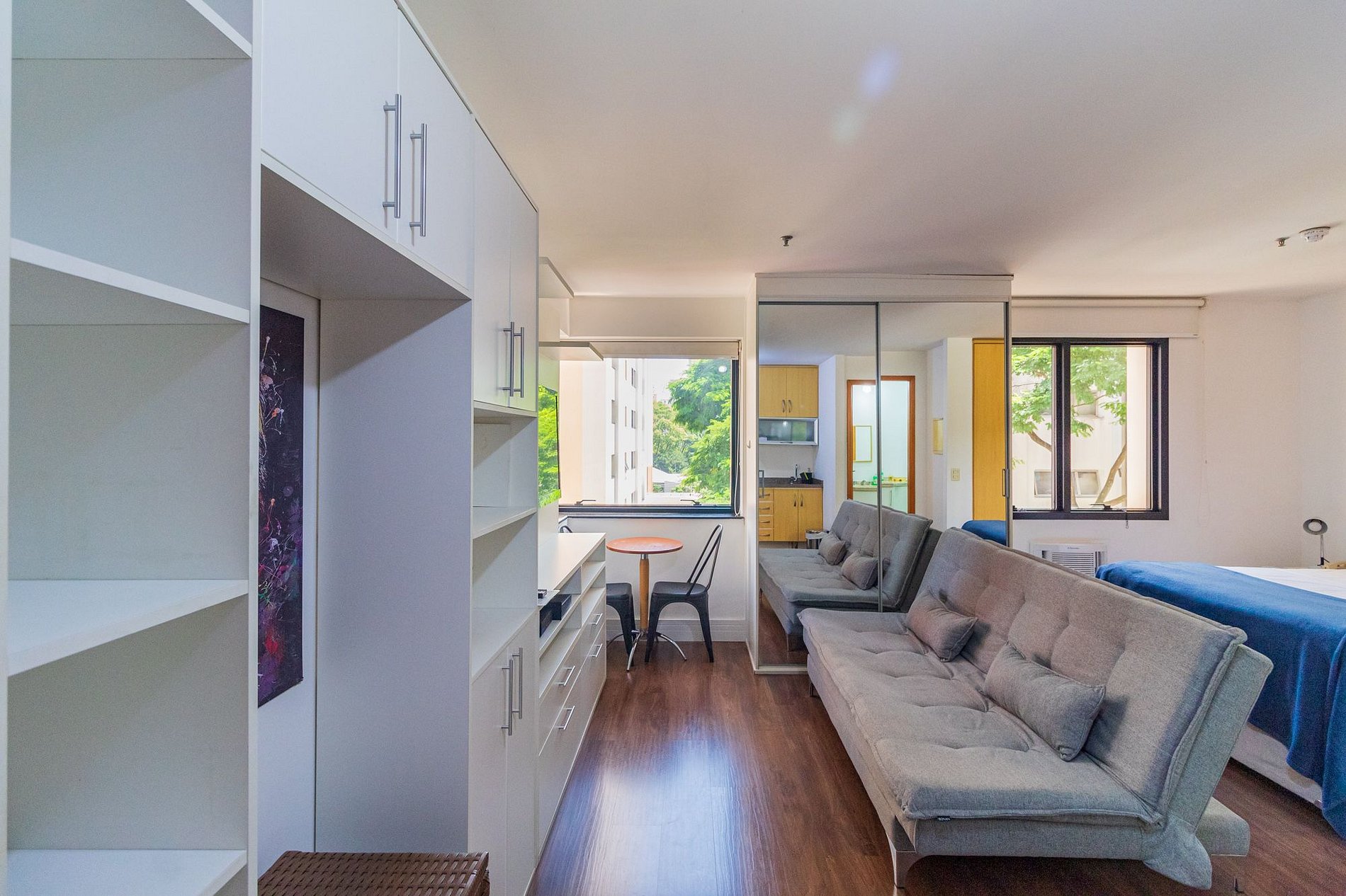 Flat com cama Queen, sofá cama de Casal