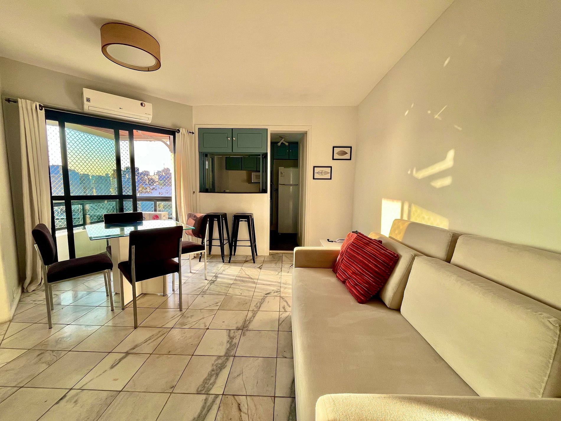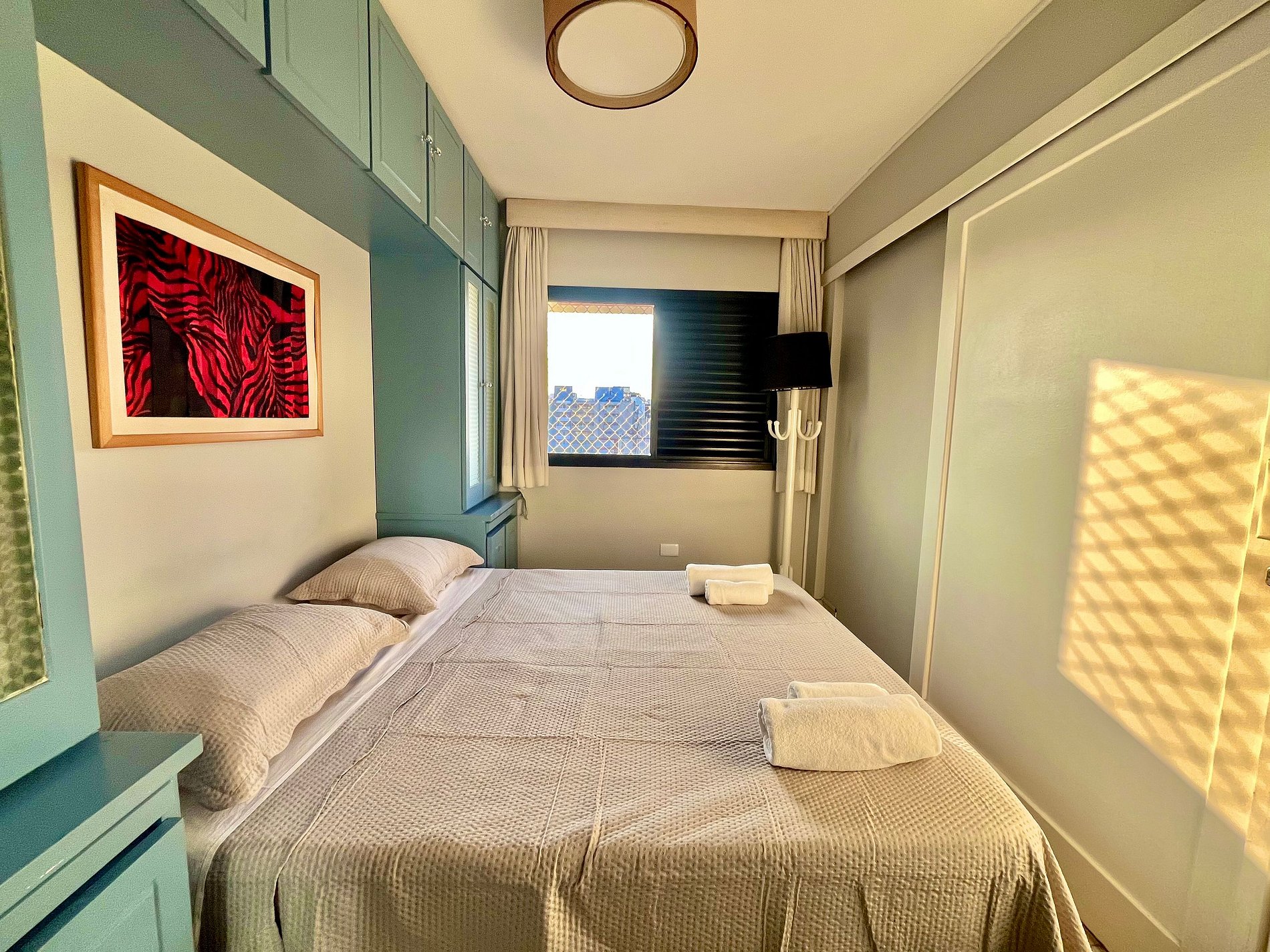 -Flat possui uma suíte com cama de casal, um sofá cama e dois colchões para colocar no chão, ideal para acomodar até cinco hóspedes.