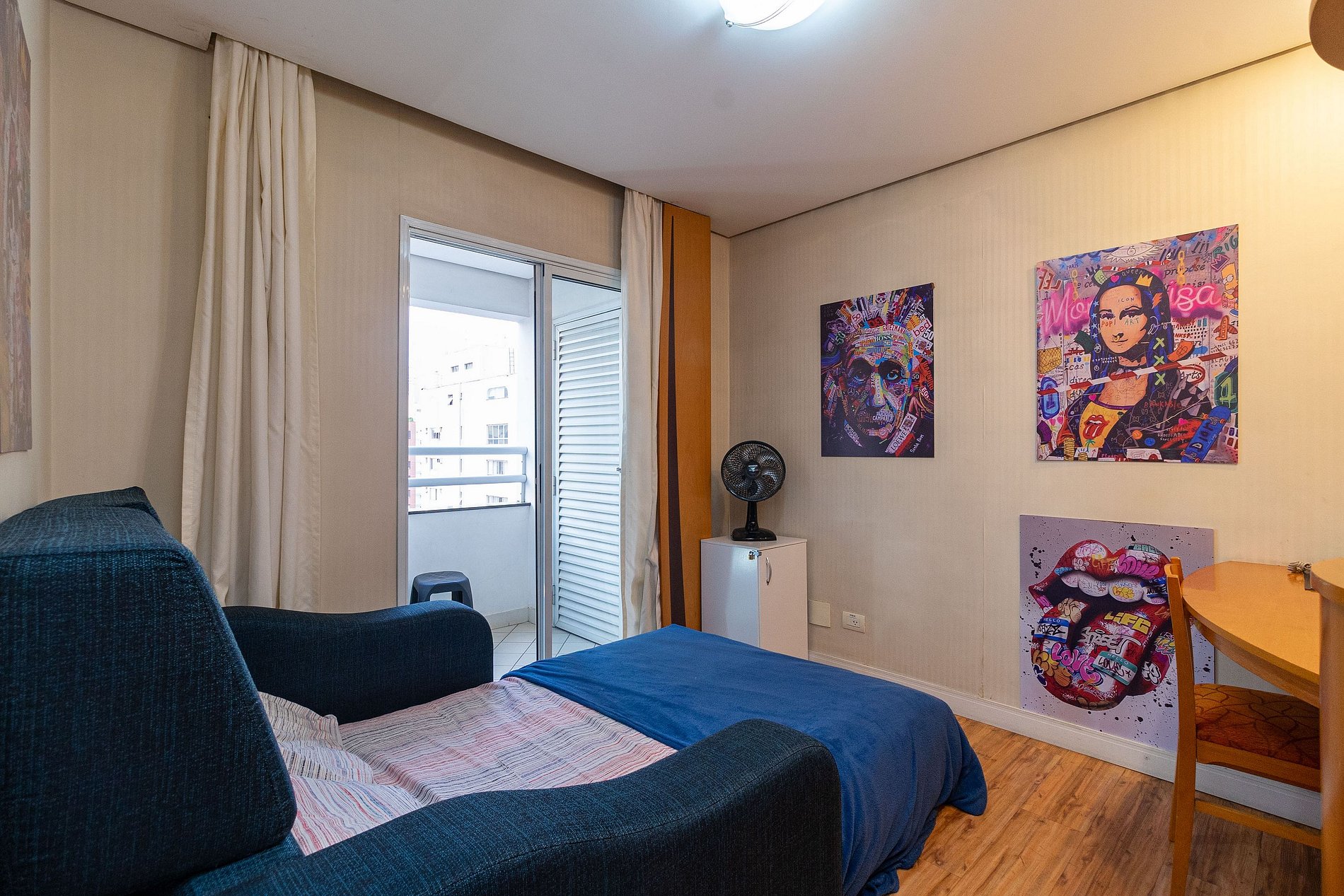 -Flat possui uma suíte com cama de casal, um sofá cama e dois colchões para colocar no chão, ideal para acomodar até cinco hóspedes.
